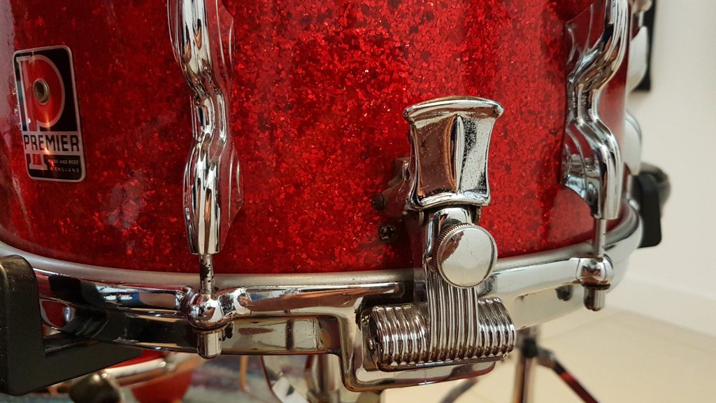 This is a Premier Royal Ace snare drum in red sparkle finish, manufactured in England in the mid 1960s. This is the first snare drum I owned. Bought by my step-father in an auction in Edinburgh in 1994, to add to a similarly-aged Premier drum kit he had acquired as part of a house clearance the year before.
